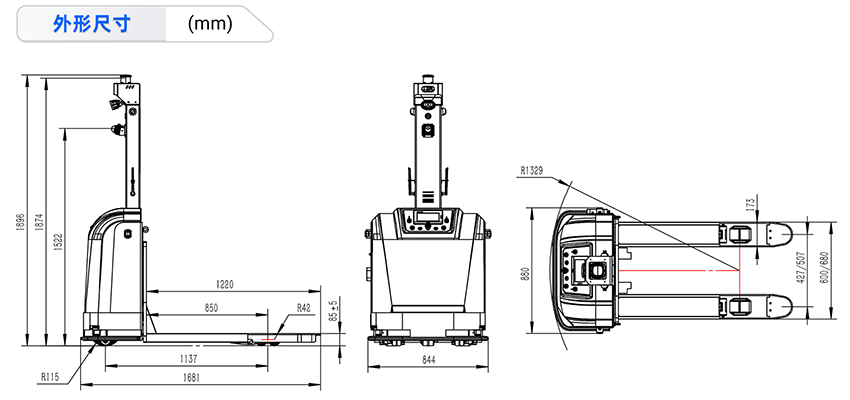 | 整车叉车:长*宽*高(不含叉尖) | 1681*880*1896mm | ||